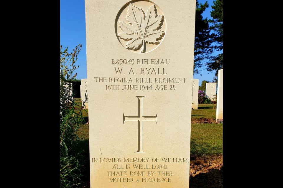 By June 15, the Regina Rifles had advanced about 20 km, to the outskirts of the city of Caen. After nine days of intense fighting, that night proved unusually quiet. Quiet, that is, until 4 a.m. on the 16th, when an enemy plane dropped a bomb on Ryall’s trench. The plane was shot down. Rifleman William Ryall lay dead. He was 27 years old.